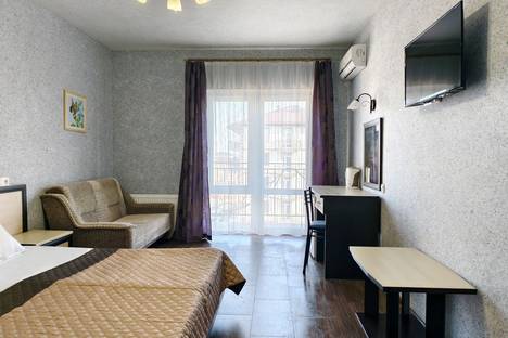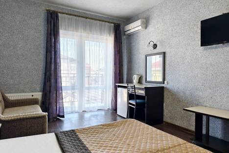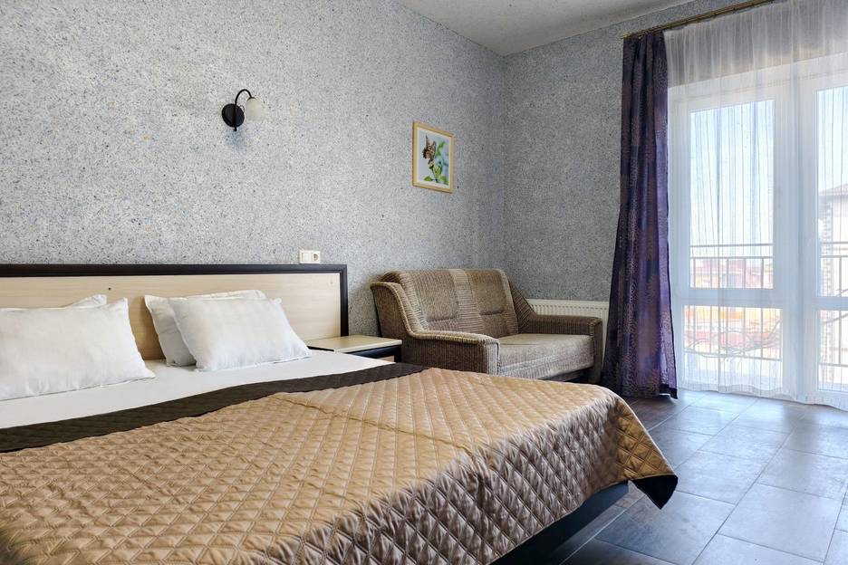 Однокомнатный номер. В номере находится двуспальная кровать, двуспальный диван (120Х190), прикроватные тумбочки, шкаф, вешалка для одежды, бра, кондиционер, телевизор, журнальный столик, туалетный столик, зеркало, мини-холодильник.