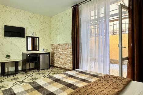 Двуспальная кровать, шкаф, прикроватные тумбочки, туалетный столик, зеркало, телевизор, сплит-система, мини-холодильник, чайник, ванная комната с душевой кабинкой, свой дворик с летней мебелью (стол, скамья)