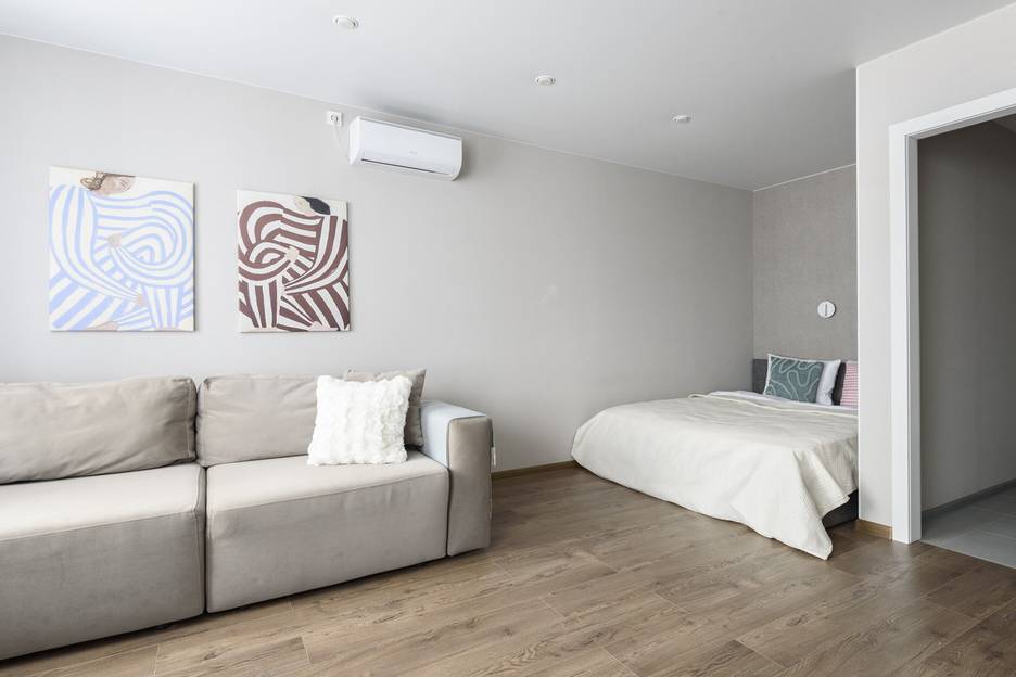 Удобную двуспальную кровать с ортопедическим матрасом и раскладной диван для двух дополнительных мест.