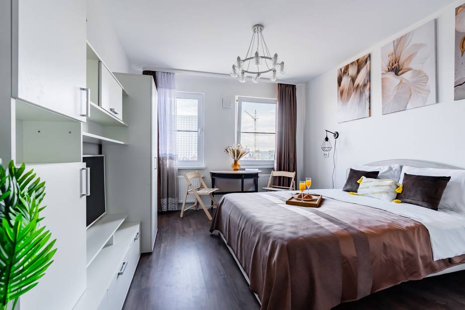 Очень уютная квартира, хорошее расположение, рядом есть магазины.