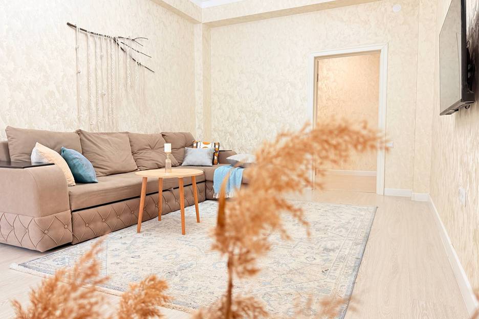 Светлая гостиная с большим двуспальным диваном и Smart TV (Умное ТВ)