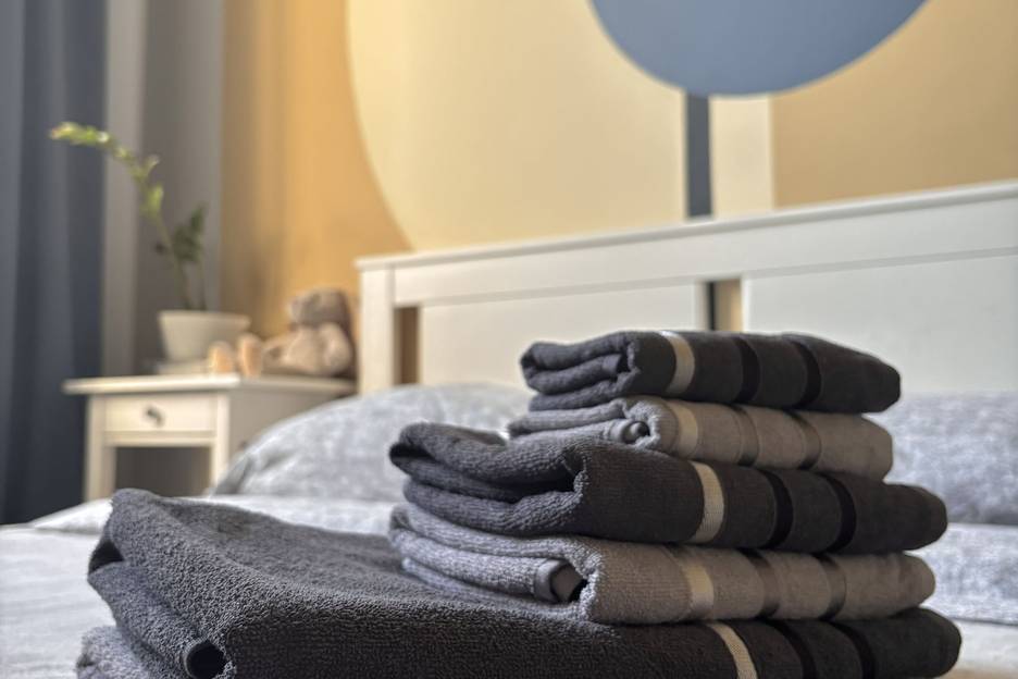 - Спальня: двуспальная кровать с ортопедическим матрасом, дополнительное комфортное спальное место с мягким матрасом, шкаф, постельное белье