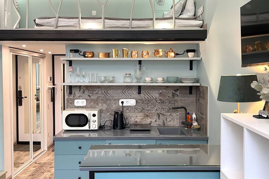 Студия с высотой потолка 3,5 м, с площадью 22 кв. м + 6 кв. м — второй ярус (спальное место king size, матрас Pullman).