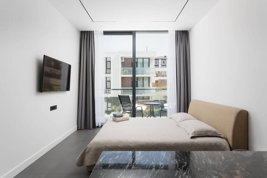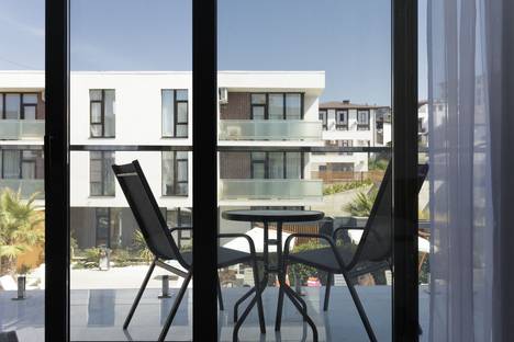 Апартамент № 6 расположен на 2 этаже комплекса с собственным балконом и садовой мебелью на нем, панорамные окна и ландшафтный дизайн станут приятным дополнением Вашего отдыха.