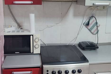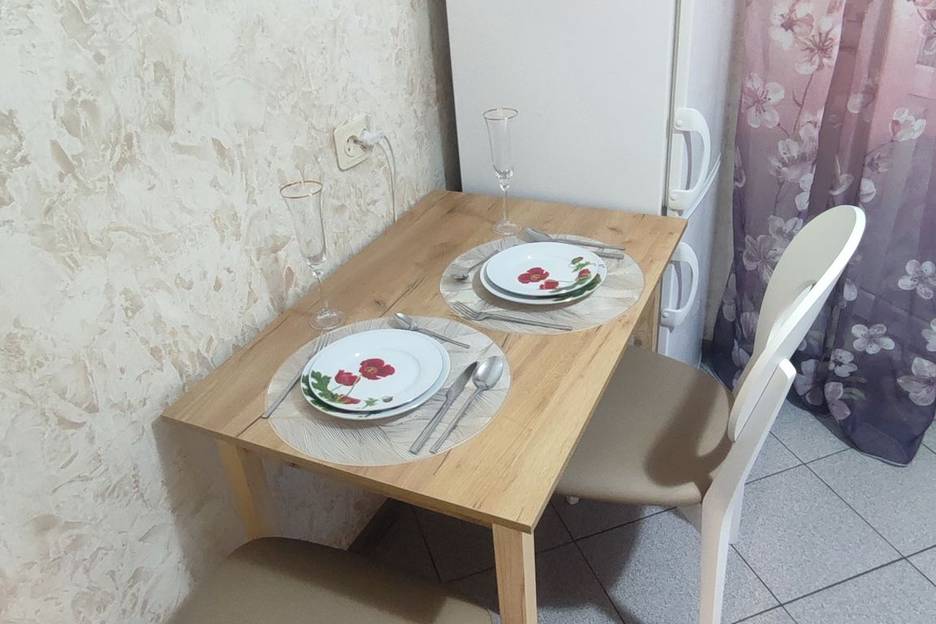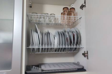 Кухня оснащена: микроволновой печью, газовой плитой, сендвичницей, большим количеством столовой посуды, холодильником, вазами для цветов, кухонными полотенцами. На лоджии есть 2 дополнительных стула для кухни + сушилка для белья.