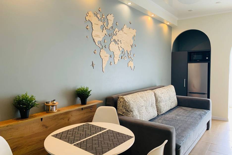 - В кухне-гостиной: большой диван-кровать со спальным местом (180 x 200 см), обеденный стол и 4 стула, ТВ.