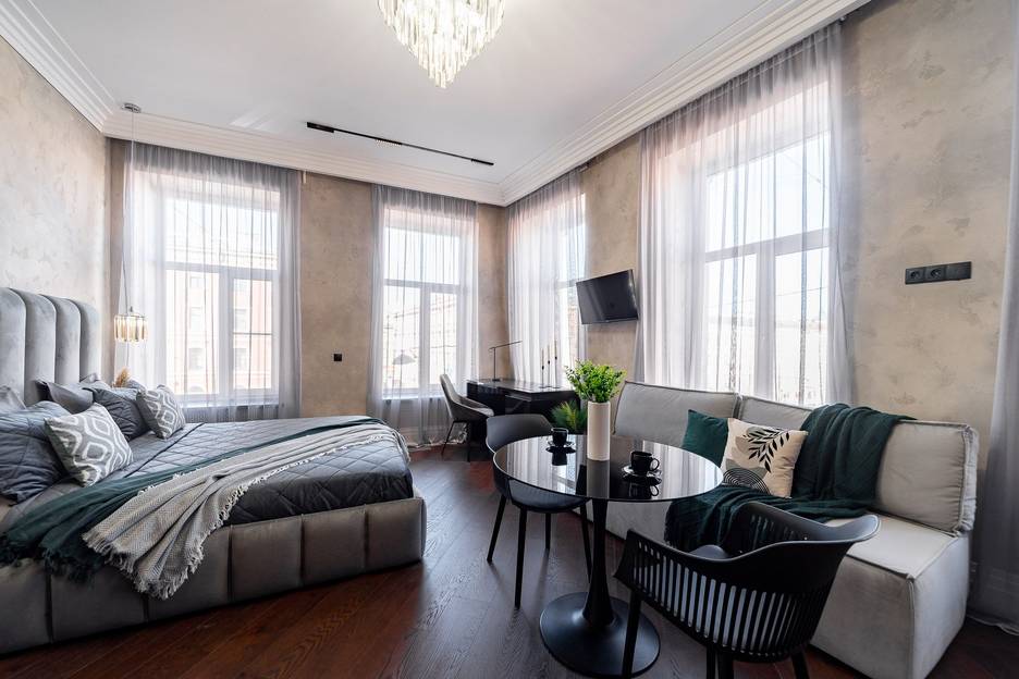 Квартира на Невском 22-24 большая, но не уютная, совсем не выглядит жилой просто место где можно переночевать но не жить, ощущение что нашли свободную мебель и приволокли в квартиру что было)) вся мебель и люстры разных цветов и разных стилей, в ванной смешное пластиковое зеркало, занавески в одной спальне не пойми какие и не было блэкаут из-за этого утром плохо спалось, также окна спален выходили на шумную улицу с открытым окном спать проблемно, а с закрытым душно ибо кондиционер был только в одной спальне. Действительность не совпадает с фото, в реальности не было ковров, зеркала во весь рост в спальне, часов, ваз, полы и двери скрипят).В Петербурге не первый раз, но впервые столкнулись с тем что нужно платить за уборку при выселении это 4500 р. при этом должны сами помыть посуду и вынести мусор, ну ок обычно всегда сами это и делаем при выезде, но как бы везде уборка включена в стоимость аренды квартиры.Не рекомендую, менеджеры придумывают как хотят, не факт что вас заселят туда куда вы бронируете и еще и нервы помотают, да и по факту получается дешевле снять отель с завтраками и уборкой.