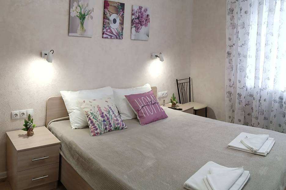 В одной комнате двуспальная кровать с ортопедическим матрасом,в другой односпальная.В каждой спальне Smart-TV, высокоскоростной интернет.Есть кухня с холодильником,микроволновкой,электрочайником,плитой и всей необходимой посудой.Ванная комната с туалетом.Гостям предоставляются одноразовые тапочки,зубные щётки,гели/шампуни, постельное бельё,полотенца.