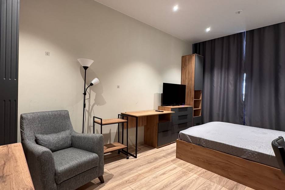 Для вашего удобства оборудована полностью меблированная зона с большим шкафом и рабочим столом. Встроенная кухня оснащена холодильником и всей необходимой техникой.