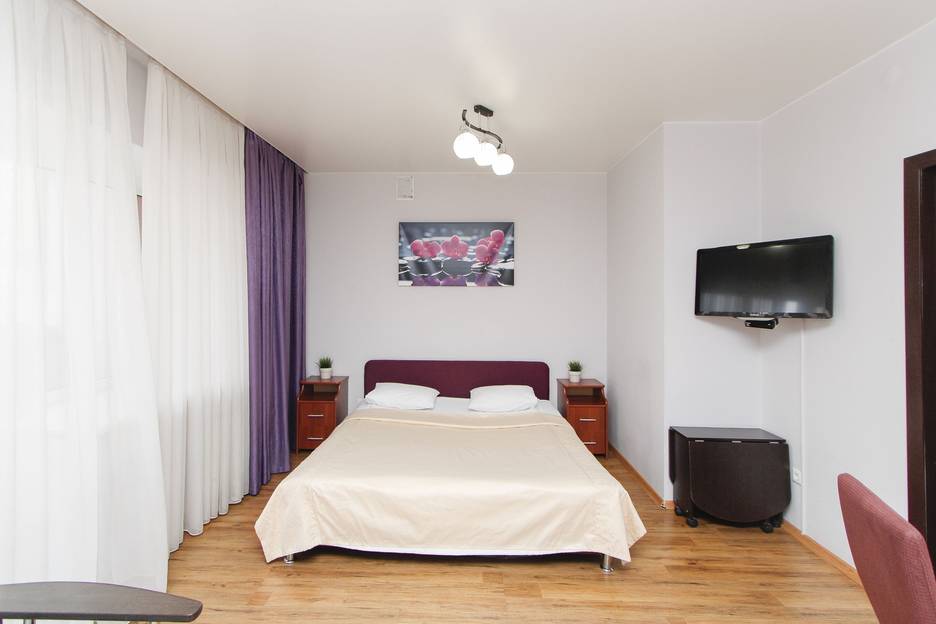 Апартаменты площадью 30 м², с большой двуспальной кроватью, укомплектованной кухней с бытовой техникой и посудой.