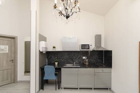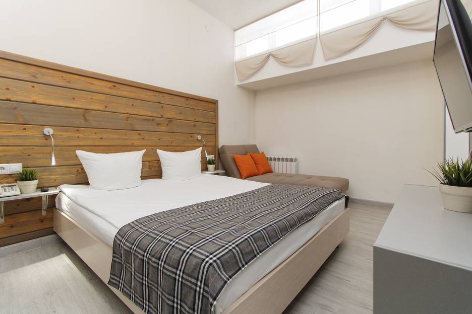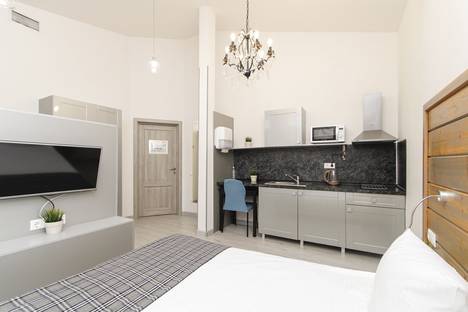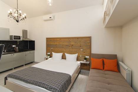 Апартаменты №4 площадью 30 м², с большой двуспальной кроватью, укомплектованной кухней с бытовой техникой и посудой.