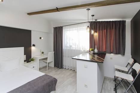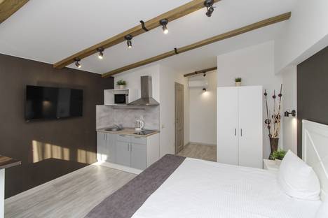 Апартаменты №8 площадью 30 м², с большой двуспальной кроватью, укомплектованной кухней с бытовой техникой и посудой.