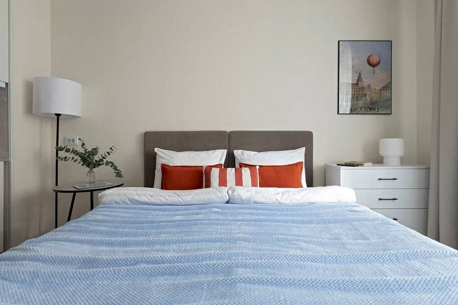 Спальной зоны с большой мягкой кроватью и белоснежным постельным бельём для вашего безмятежного сна. При желании можно использовать эту мебель как односпальную кровать, как двуспальную или как две односпальные. Напротив кровати расположен телевизор: вечером вы сможете расслабиться за просмотром любимых фильмов или сериалов, не покидая тёплую постель.