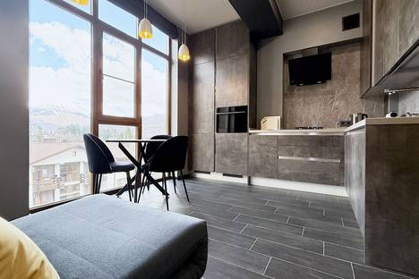 Большая студия с интерьером, выполненным в современном стиле с элементами минимализма и скандинавского направления. Потрясающий панорамный вид из всех окон на горы.