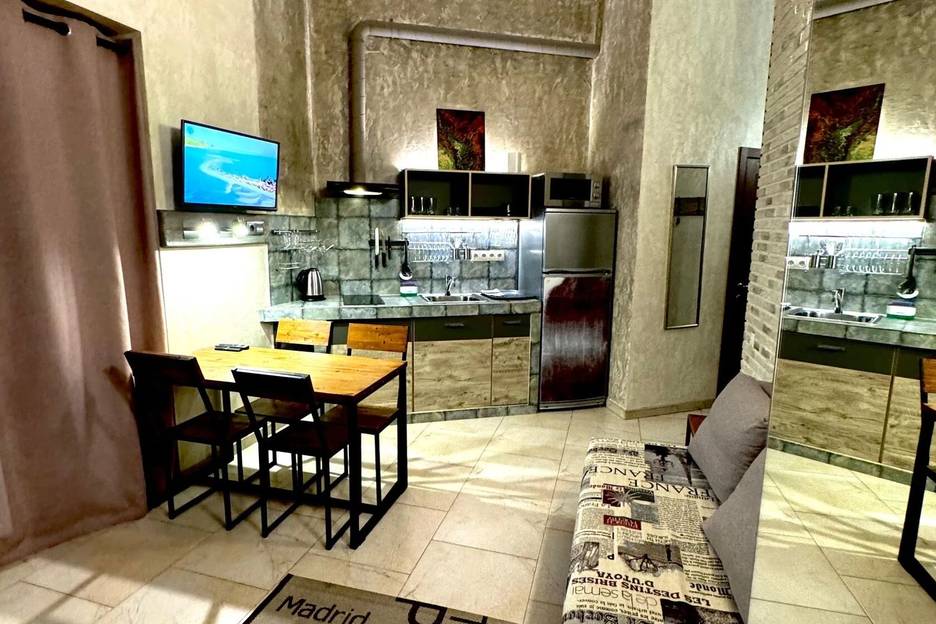 В студии двухуровневая кровать (на каждом уровне матрас размером 160/200) и раскладной диван.