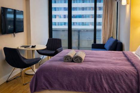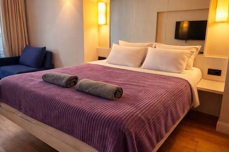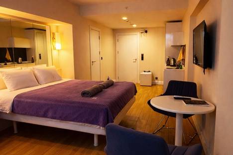 В апартаментах — удобная двуспальная кровать с качественным постельным бельём, зона отдыха, мини-кухня и собственная ванная комната.