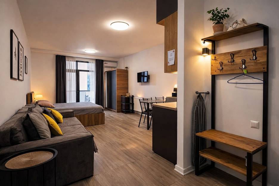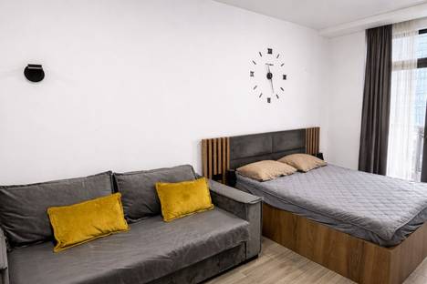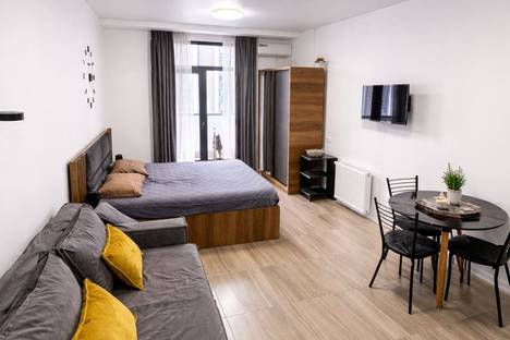 Современная и уютная студия с продуманным дизайном и всем необходимым для комфортного проживания. В квартире удобная двуспальная кровать, раскладной диван, оборудованная кухня, кондиционер и быстрый Wi-Fi. Из окна - приятный городской вид, а балкон станет отличным местом для отдыха.