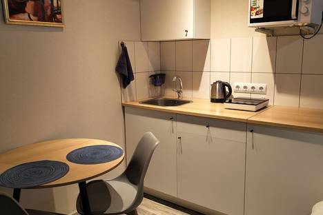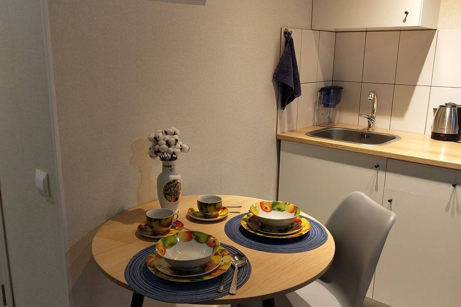 Кухня с индукционной плитой, СВЧ-печью, мини холодильником, чайником, фильтром для воды Аквафор и полным набором посуды.