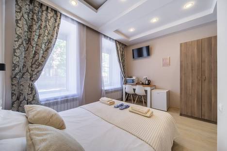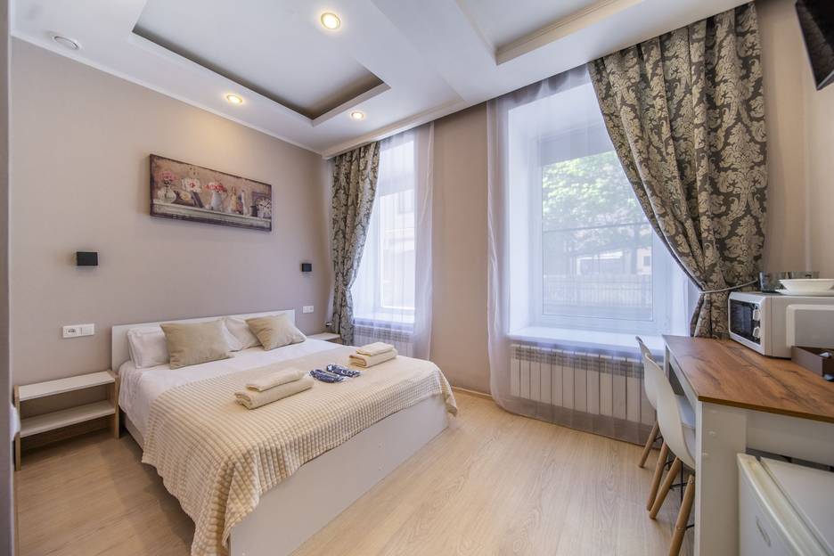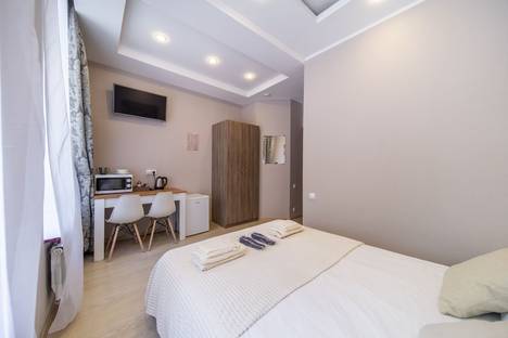 В комнате есть двуспальная кровать, шкаф, стол, стулья, холодильник, микроволновая печь, чайник, посуда. Как таковой кухни нет, но по запросу предоставим мультиварку и удобную раскладушку с матрасом для третьего человека (необходимость места для третьего человека указывайте в бронировании). В числе удобств студии телевизор с плоским экраном, фен и Wi-fi.