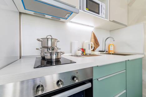 Функциональная кухня с варочной поверхностью, духовым шкафом,вместительным холодильником, чайником и набором хорошей посуды для приема и приготовления пищи, столовыми приборами и аксессуарами.