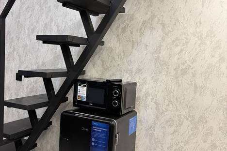 В студии с комфортом можно разместиться 4 гостям. На мансардном этаже двуспальная кровать, на первом этаже - двуспальный диван.