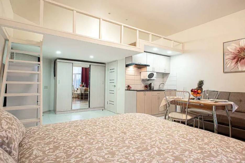 Студия небольшая, но есть всё необходимое. Горячая вода была всегда. На 2-м этаже немного душновато спать, но всё это окупается хорошим расположением квартиры. Рядом остановки общественного транспорта, метро, кафе, магазины, театр Андрея Миронова. До Петропавловской крепости и Ленинградского зоопарка ходили пешком.
