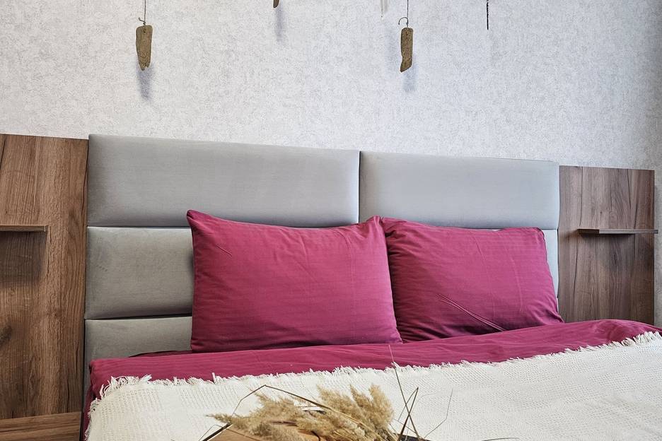 - двуспальная кровать 160×200 с хорошим матрасом и качественным постельным бельём. Никакой синтетики, для вас исключительно натуральные приятные ткани.