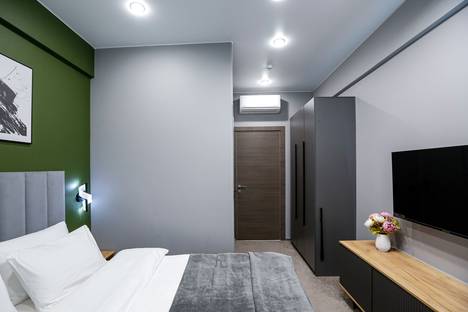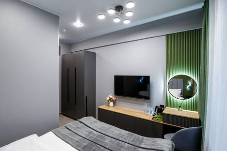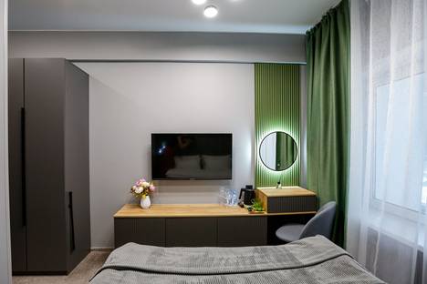 Номер оборудован двухспальной кроватью, широкоформатным телевизором со Smart TV, мини-холодильником и кондиционером, компактным рабочим столом, а также шкафом и тумбой для одежды.