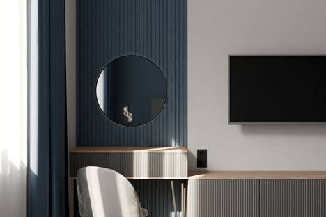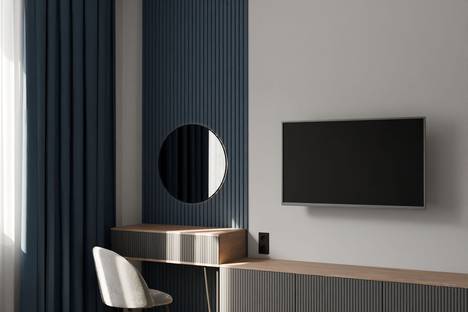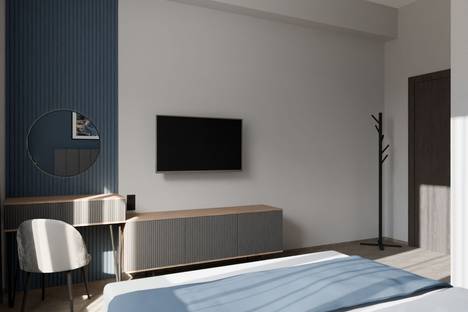 Номер оборудован большой двуспальной кроватью с матрасом повышенной комфортности, большим рабочим столом, широкоформатным телевизором со Smart TV, доступом в интернет, мини-холодильником и кондиционером, а также шкафом и тумбой для одежды.
