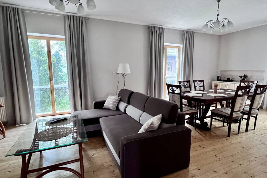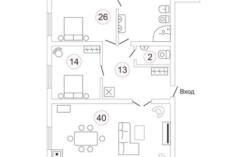 •Гостиная-столовая 40 кв.м — диван, обеденный стол, ТВ, кухонный гарнитур, балкон.