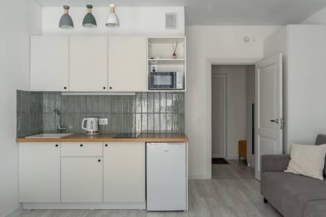 - Есть фен, утюг, гладильная доска и вся посуда для готовки. - Стиральная машина, микроволновка, чайник. - Двухконфорочная быстрая плита для готовки. - СМАРТ ТВ с фильмами и сериалами по подписке ИВИ.