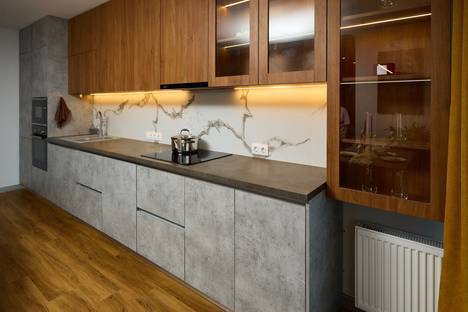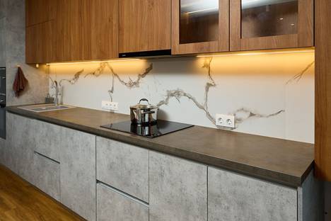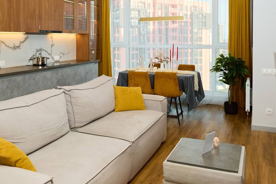 Кухня-гостиная (более 20 м²): Сердце квартиры. Здесь расположен удобный раскладной диван, где могут с комфортом разместиться еще два гостя. Идеально для семей или небольших компаний (всего до 4-х спальных мест).