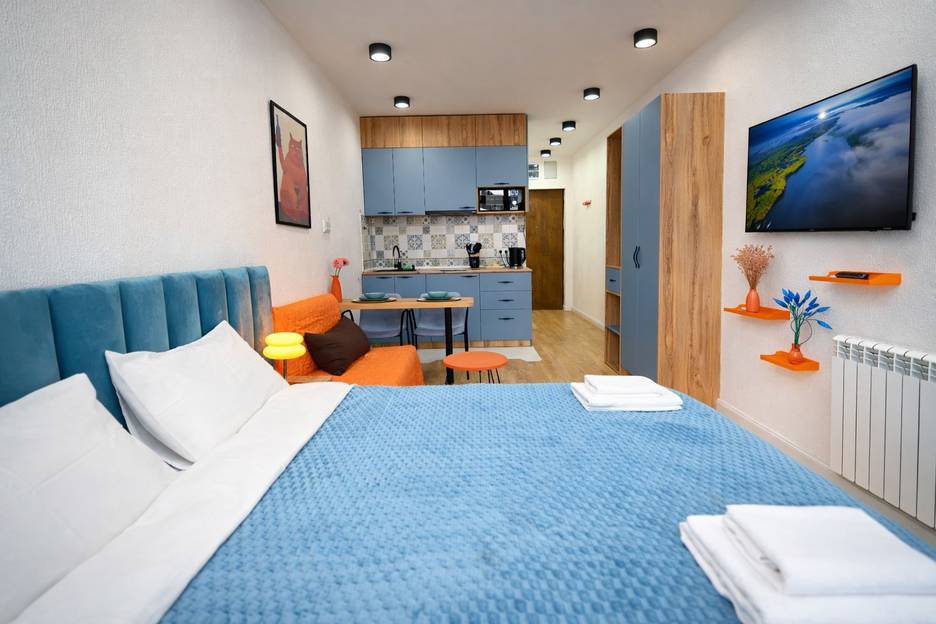 Студия оформлена в современном стиле с тёплыми элементами дерева и свежими голубыми акцентами. Пространство продумано до мелочей — уютно, функционально и комфортно.