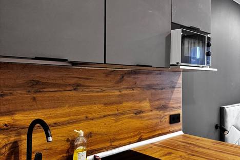 Полностью оборудованная кухня: на кухне есть всё необходимое для приготовления блюд: плита, микроволновая печь, холодильник и посуда.