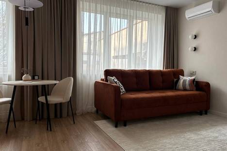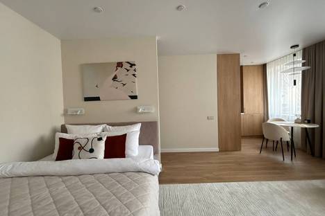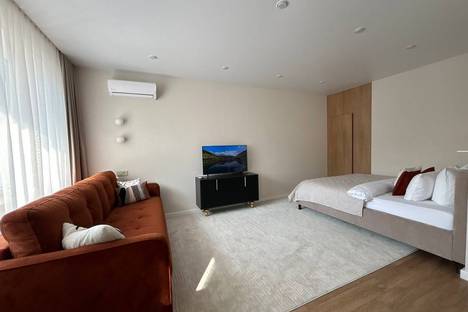 Здесь с комфортом разместятся трое гостей: в апартаментах большая кровать и диван. Кухонная зона оборудована холодильником, СВЧ, плитой, и посудомоечной машиной. В квартире установлены стиральная машина и кондиционер.