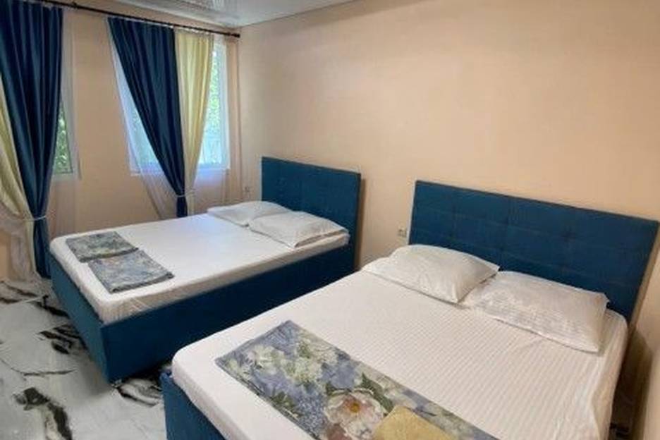 две двухспальных кровати с ортопедическими матрацами, подушки перьевые по желанию можно силиконовую покласть, шкаф, обеденный стол и четыре стула. балкона нет так как это первый этаж но есть зона отдыха с навесом и оборудованной зоны для отдыха там можно курить.