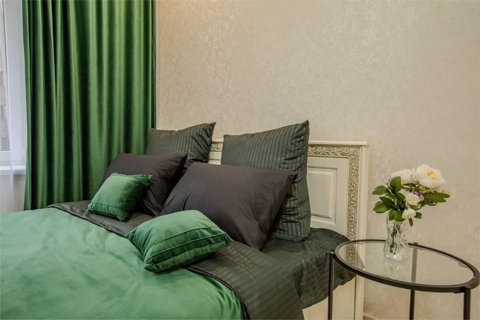 • уютную спальню с двухспальной кроватью и плюшевым диваном;