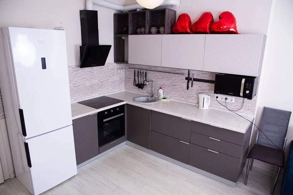 Кухoнный гарнитур с бытовой техникой и посудой.