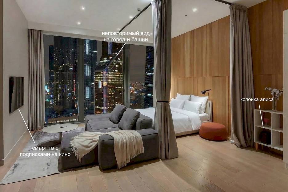 — современная и уютная студия в Москва Сити с продуманной планировкой, панорамными окнами и впечатляющими видами на достопримечательности города и башни. Пространство создано для комфортного отдыха и проживания: стильный интерьер, много света и атмосфера премиального апартамента в самом центре деловой Москвы.